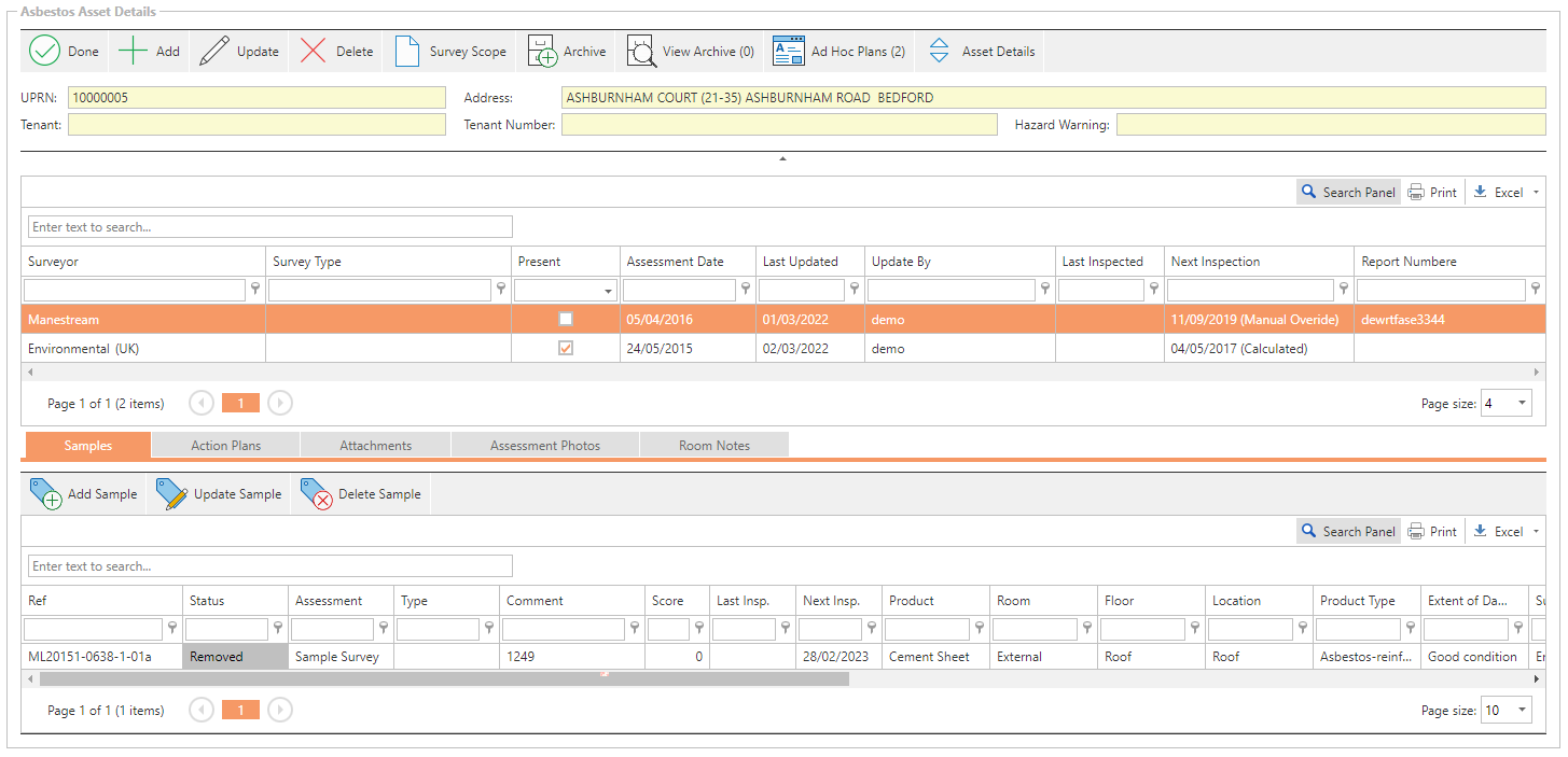 Once at asset has been searched for all assessments that currently exist for the asset are displayed. Selecting an assessment in the Assessments grid will show all the associated samples, action plans, file attachments, photos and room notes in the tabs.