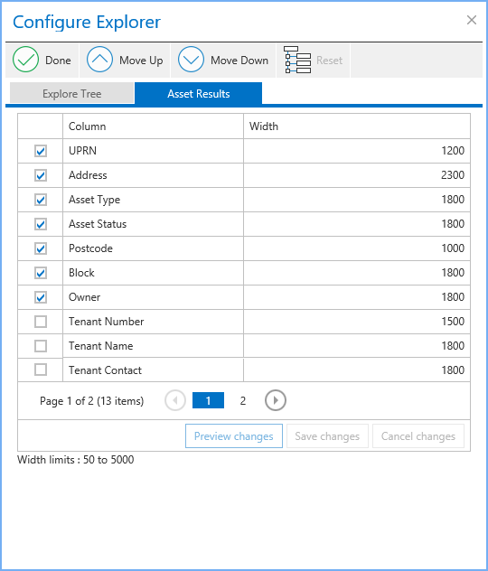 Move the selected Explore Tree or Asset Results item up one place. If this is an enabled Explore Tree item its new position is reflected in the Example area.