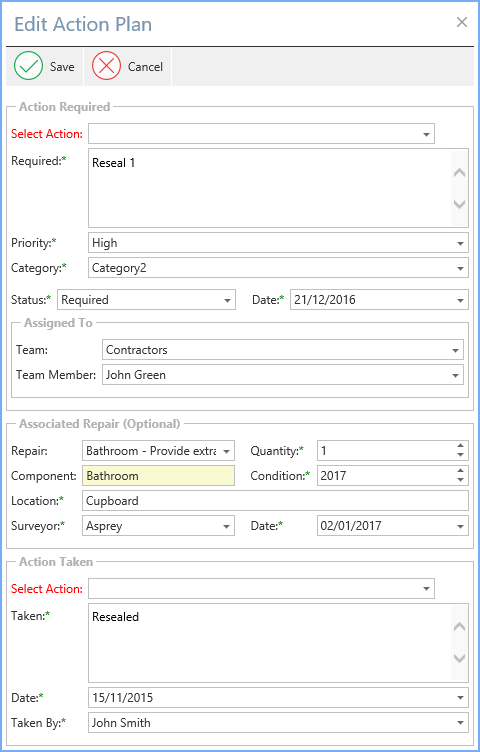 Note: If a repair is associated with the action plan the Condition year, Quantity, Location and Surveyor are required.