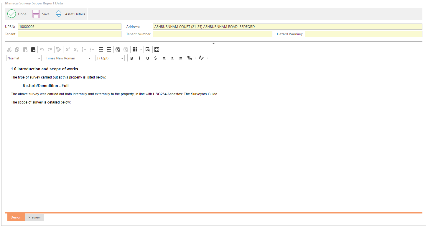 The Manage Survey Scope Report Data screen allows the scope to be edited. This is displayed on the Asbestos report.
