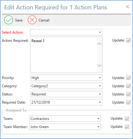 Saves the changes to the actions required to all selected action plans. If multiple actions plans are to be updated and the existing data is not the same, then a warning is given of this prior to saving.