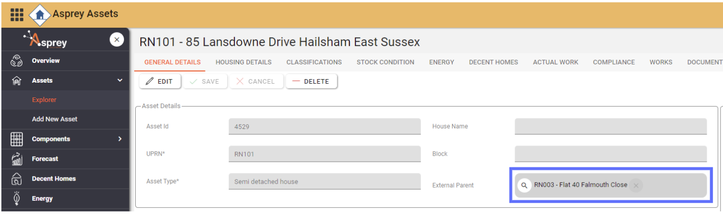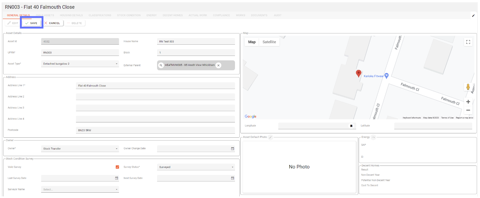 The General Details tab provides an overview of the asset. it provides key information about the asset such as its address, the ownership, stock condition status, energy, housing quality any images and a map.