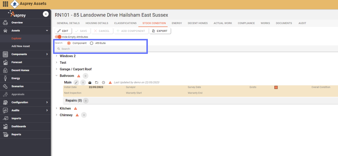 The Stock Condition tab shows all the component details for an asset and any repairs associated with the asset. Click on the chevron next to the section you want to see details for and it will expand. Details can be hidden again by clicking on the chevron.