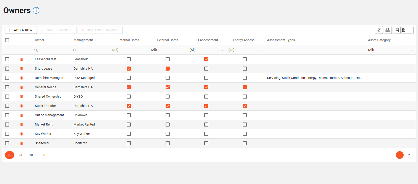 The Owners are used to inform all areas of Asprey Assets which utilise Owners, therefore, if an Owner does not appear on this screen, it cannot be used by the application.