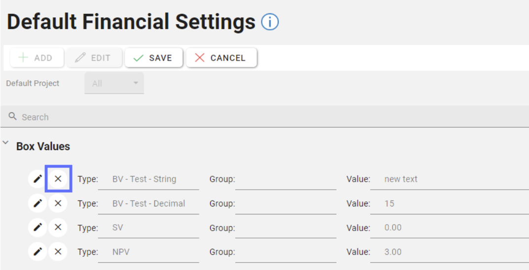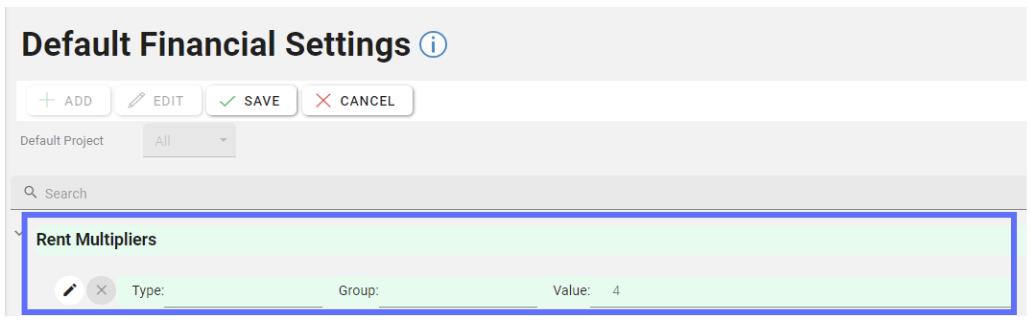 Clicking on a pencil button next to a setting will open up the “Edit Default Financial Setting” dialogue allowing you to edit the Type, Group and Value.