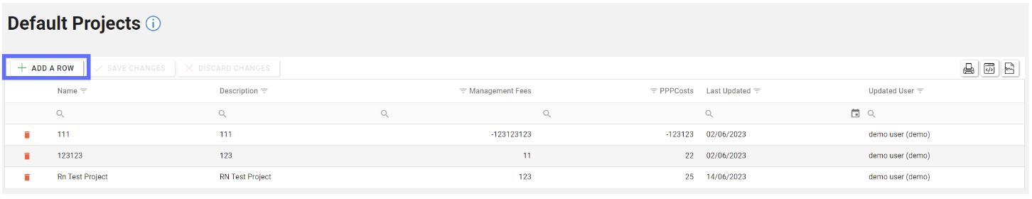 To create a Default Project click on the “Add A Row” button in the toolbar at the top of the screen.