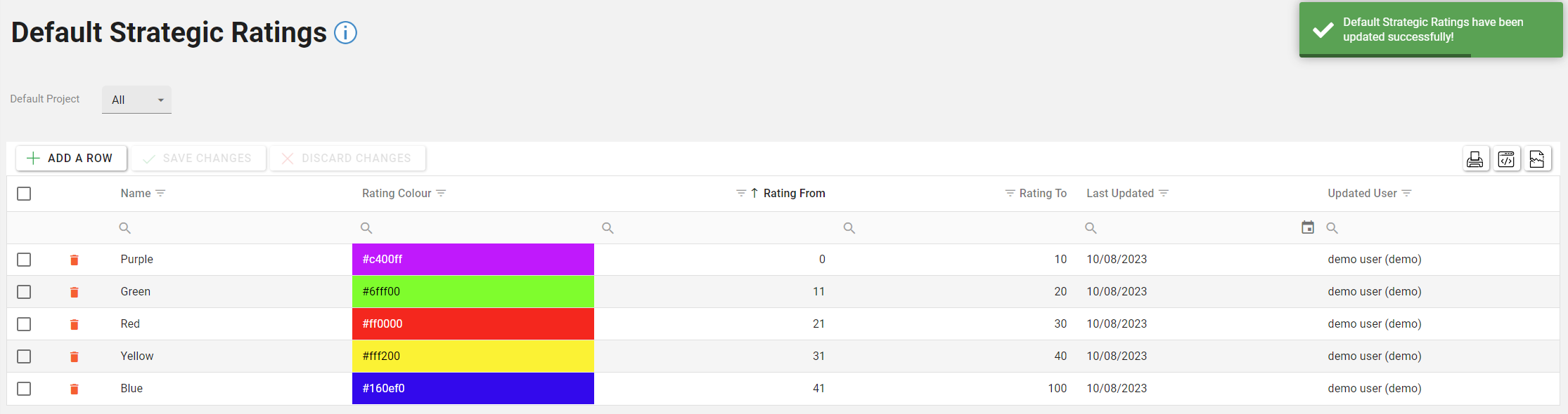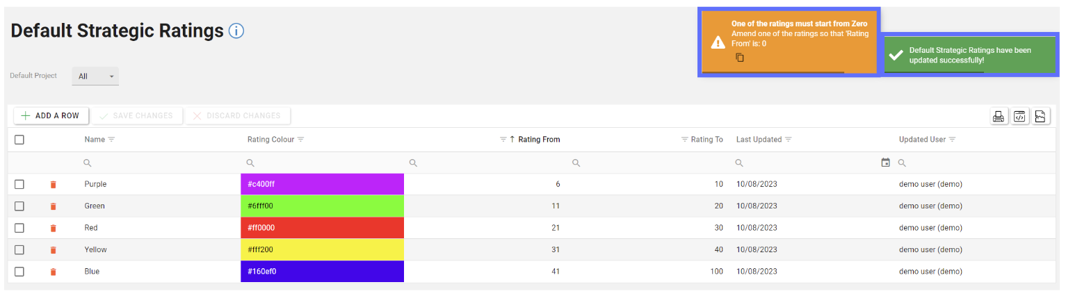 The changes will be saved to the database, this will be confirmed by the green toast popup message in the top right corner of the screen, reporting “Default Strategic Ratings have been updated successfully!”.