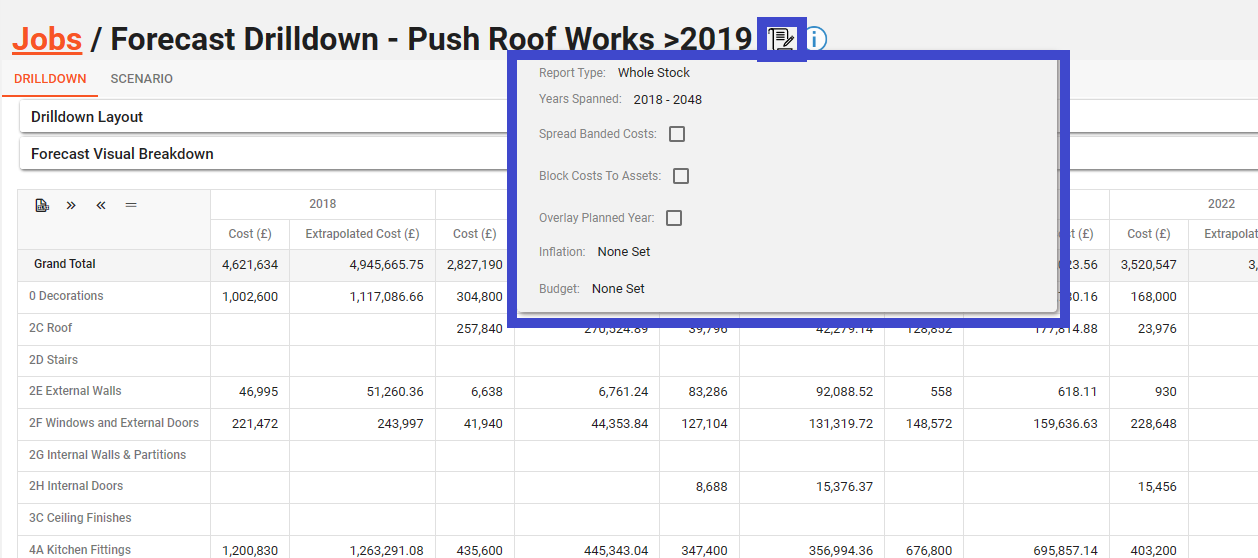 When the “Drilldown” button has been clicked, the screen will load the Forecast data for the selected Job. There are two tabs within the forecast job “Drilldown” and “Scenario”.
