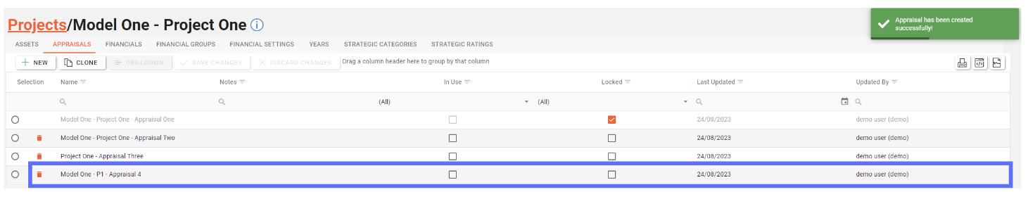 This instantly create the new Project Appraisal and add it to the grid of existing Project Appraisals.