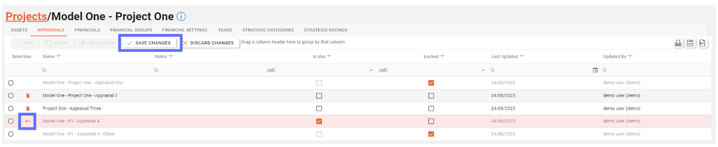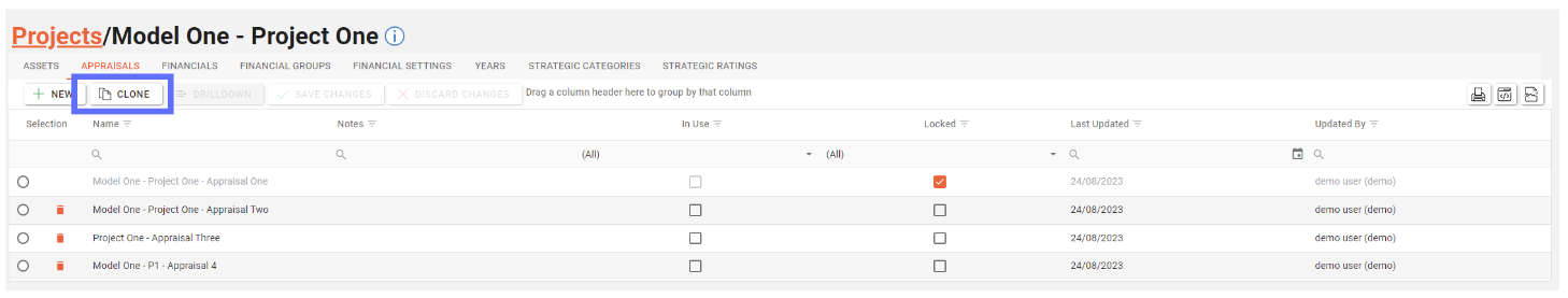 The Project Appraisal tab allows a user to create, clone, edit and delete Project Appraisals for use within the Appraisal Module of Asprey Assets.