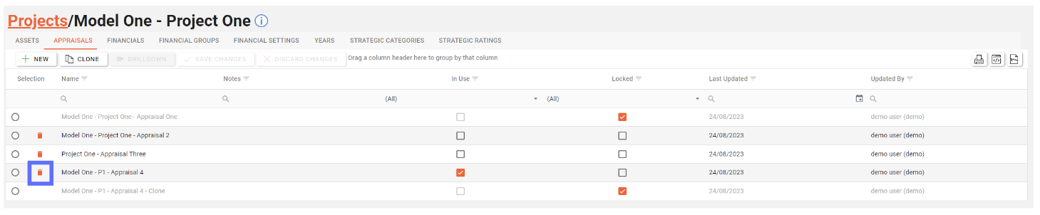 Choose the unlocked Project Appraisal you want to delete by clicking on the trash can button adjacent to the row you want to remove.