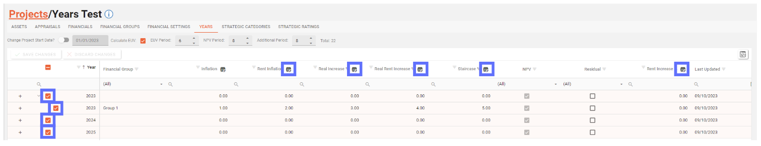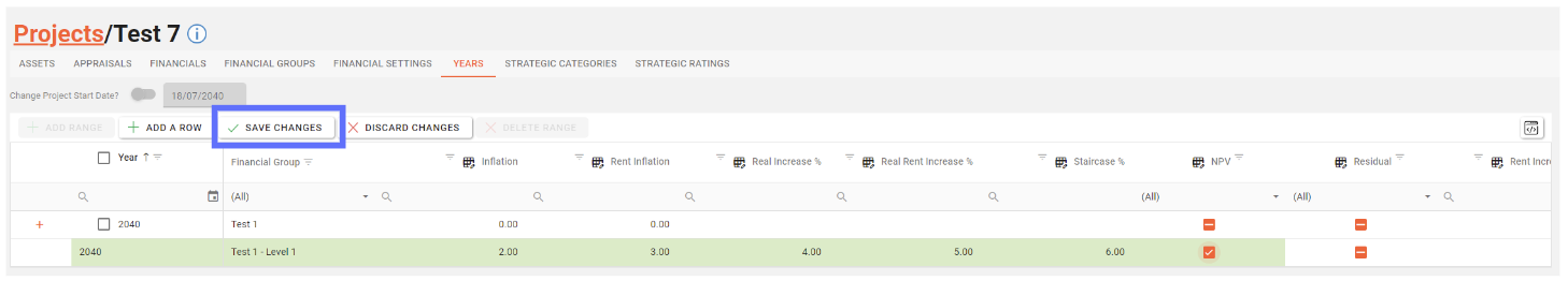 The Project Years tab allows a user to add, edit and reduce Project Years for use within the Appraisal Module of Asprey Assets.