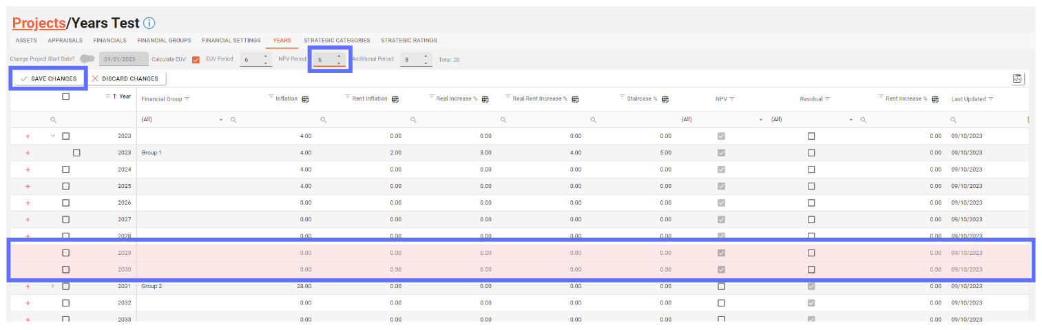 For example reducing the NPV Period from 8 to 6 will mark the last two NPV years for deletion. (see below)