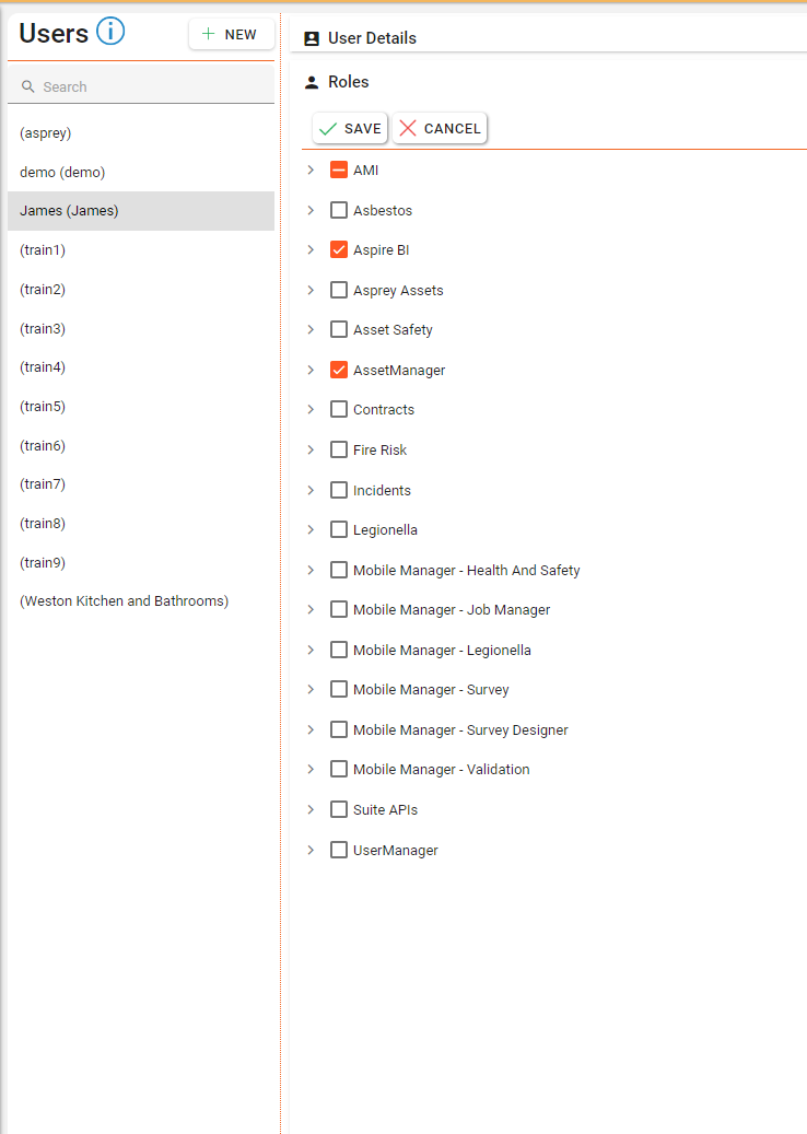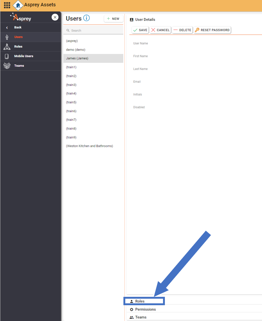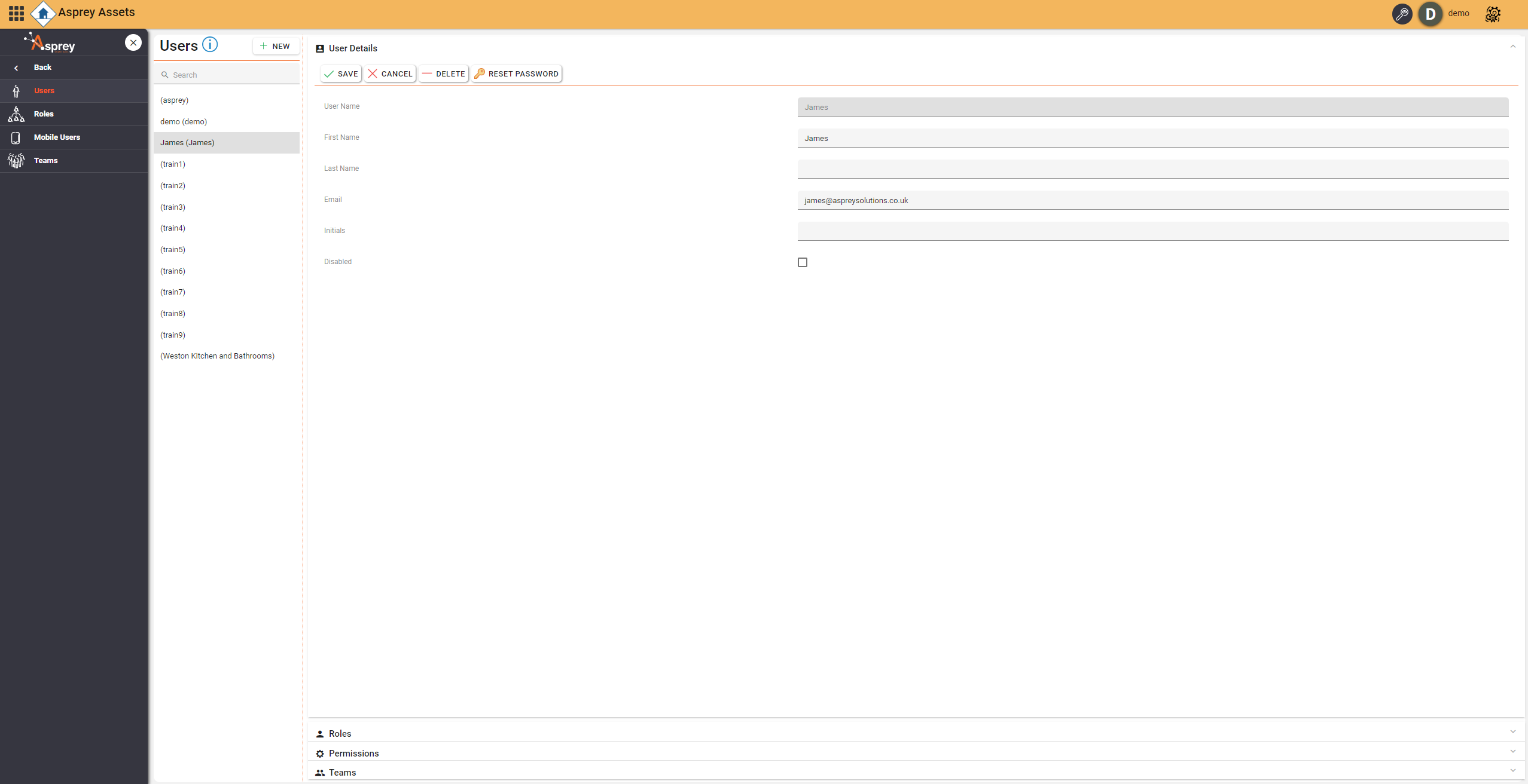 To assign a different role to a user, select the roles section of the Users screen, and click the required roles from the options available. Once the new roles have been selected, click the “save” button.