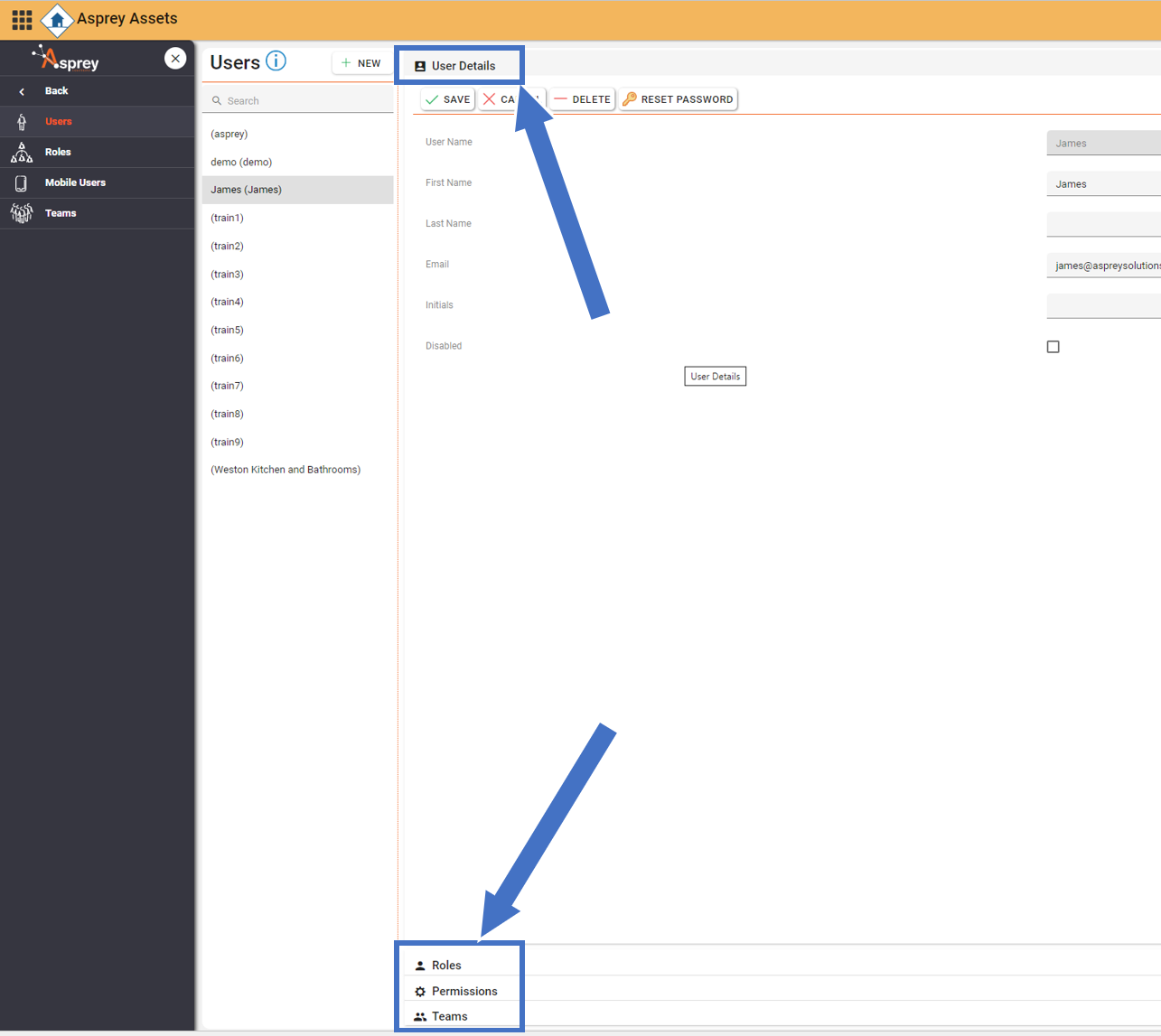 In the User Details section, this will show key information regarding the user such as “User Name”, First and Last Name, the Email address and if the user is disabled. A User being disabled means the user cannot log in and must be enabled to access Asprey products.