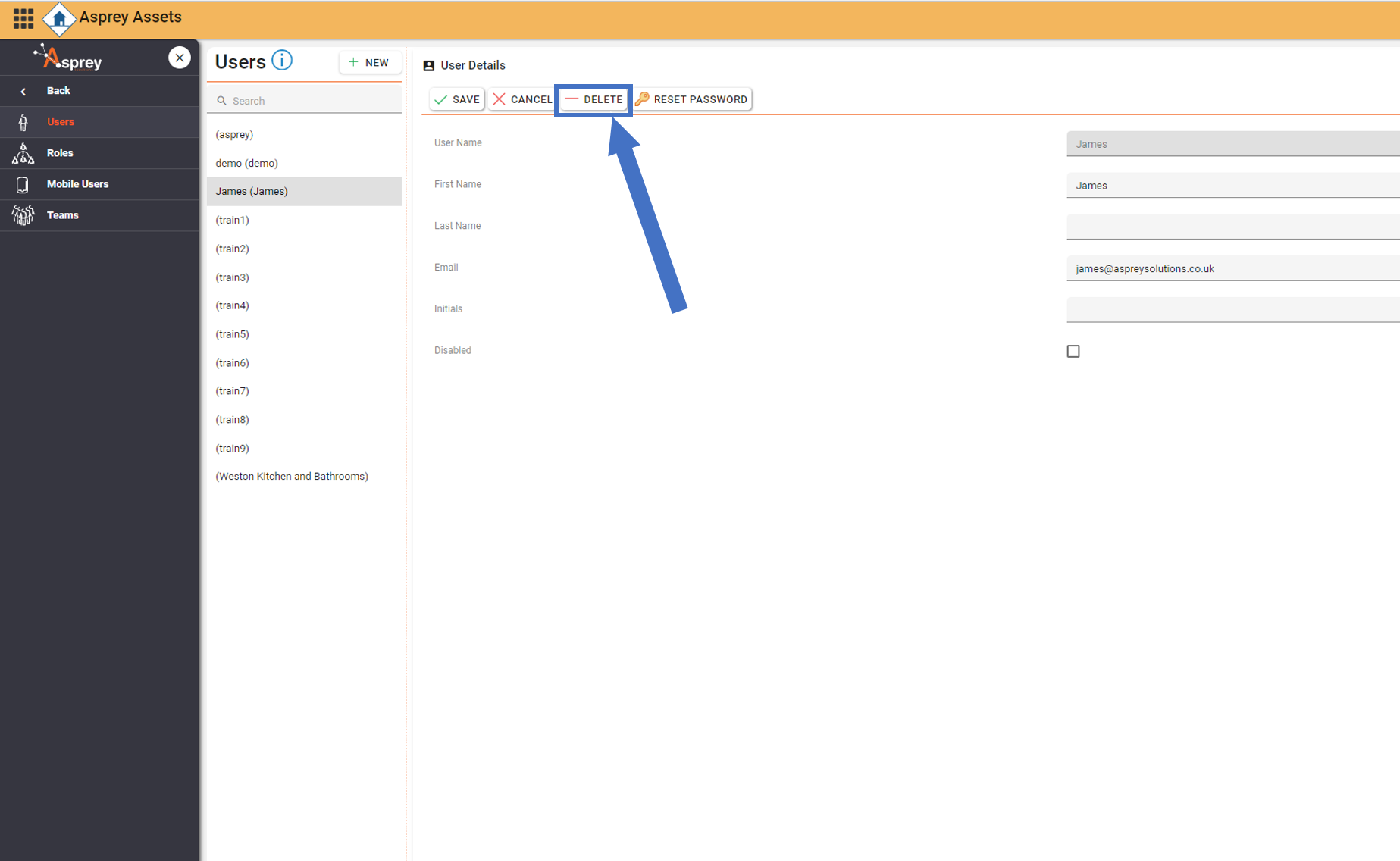 To delete a user, select the user from the Users list and under the User details, click the “Delete” button.