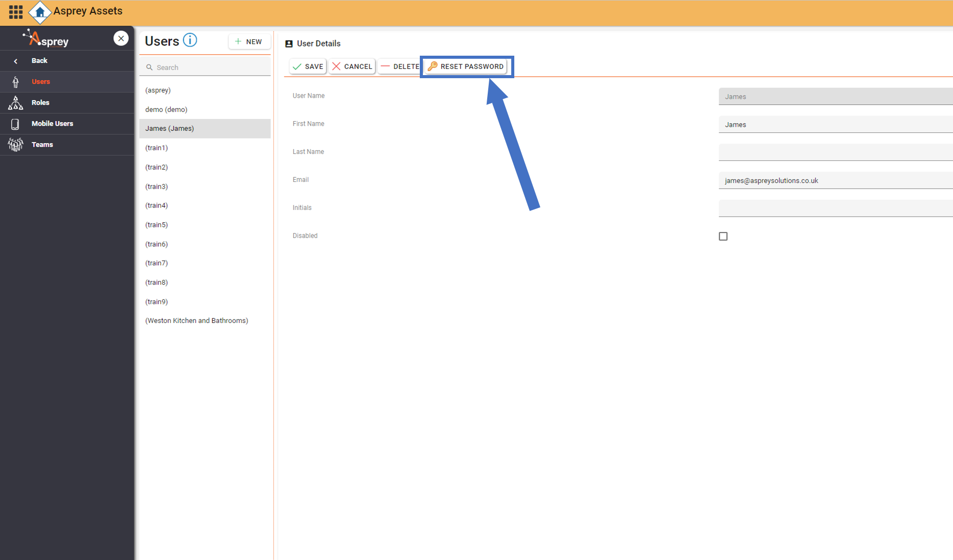 To reset a user’s password, select the user from the left-hand side and click the “Reset Password” button.