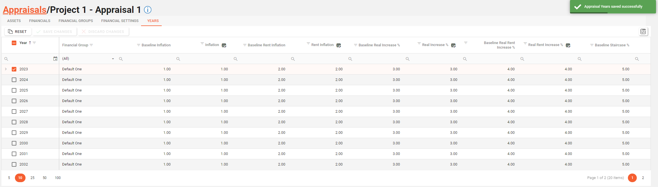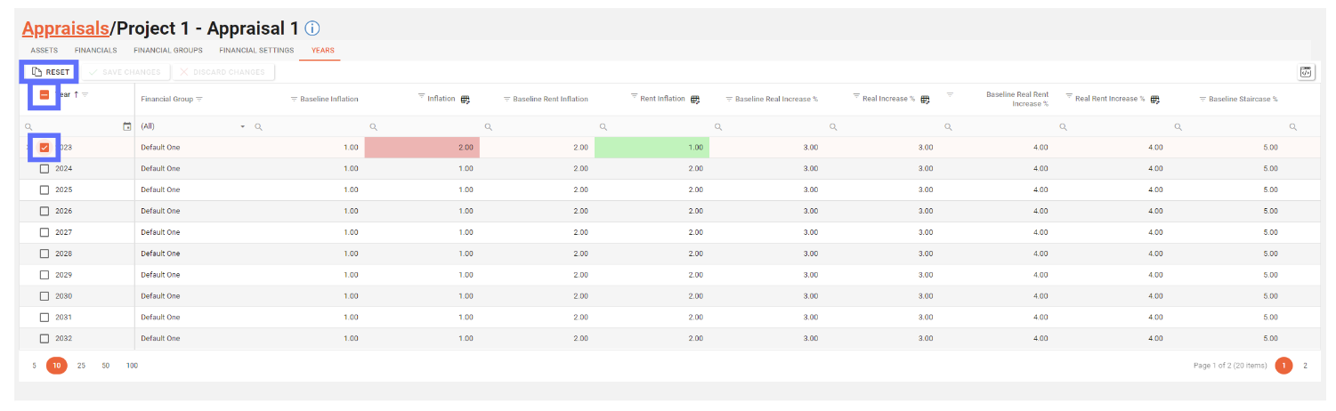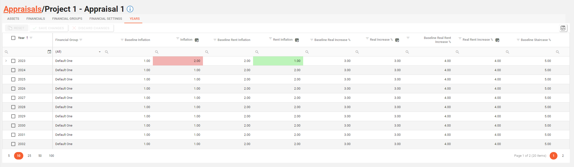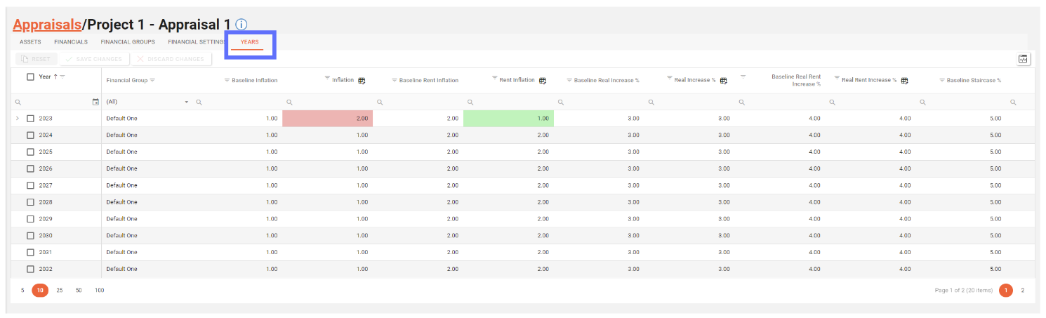 Please note that baseline cells can’t be overridden these originate from the parent Project Year row. They can only be edited on the Project Years tab. Any edits to baseline values in the Project Years tab will be reflected in the Appraisal Years screen.
