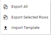 ![]() ![]() | Export data into import template | This button allows the user to export the data in the current screen. The options are to export all the data, export the selected rows or to import additional data by using the import template. |
