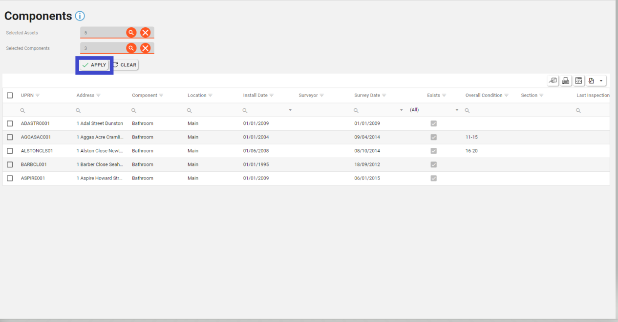 To filter the components, click the orange magnifying glass button in the Selected Components box. This will open up a list of components to filter. Once the required components are selected, click the “Select” button to add these components to the search.