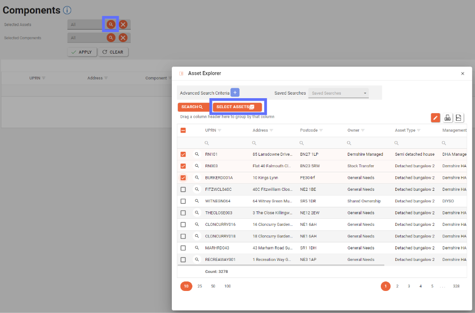 To select Assets, click the orange magnifying glass button in the “Selected Assets” box. This will open the Asset Explorer. When you have filtered and found the required Assets click the “Select Assets” button.