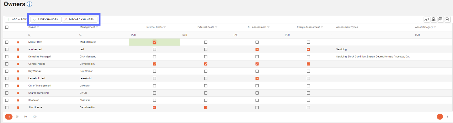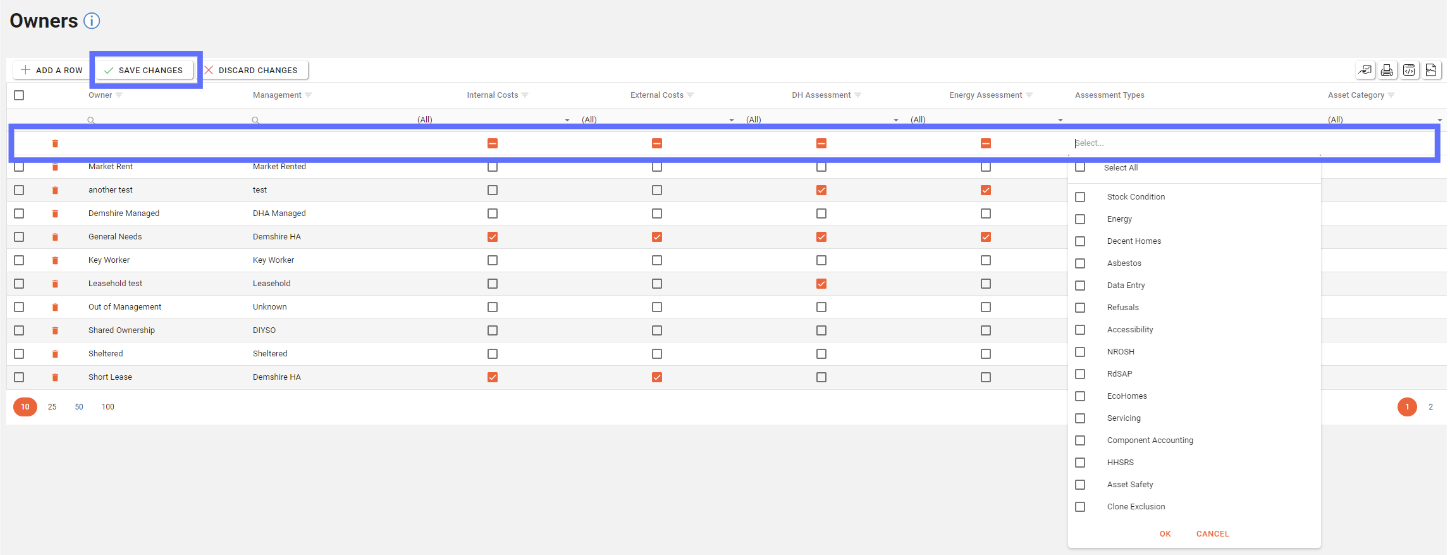 To edit an existing Owner, select the row you wish to edit and then select the field to be edited and overwrite the existing data. When all of changes have been made to the relevant columns, click the “Save Changes” button.