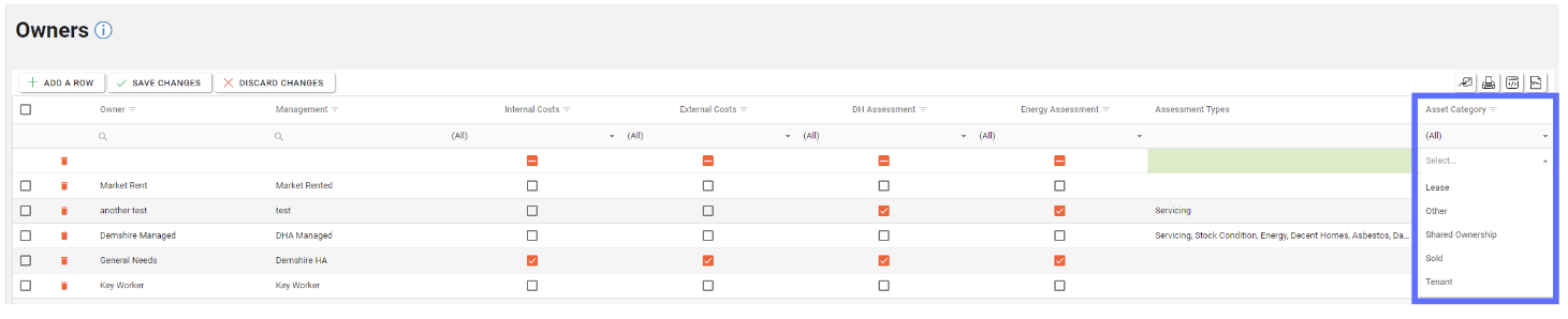 The Owners are used to inform all areas of Asprey Assets which utilise Owners, therefore, if an Owner does not appear on this screen, it cannot be used by the application.