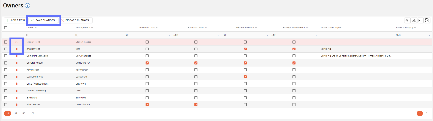 To delete an existing Owner click the trash can button in the row of the Owner you wish to delete from Asprey Assets.