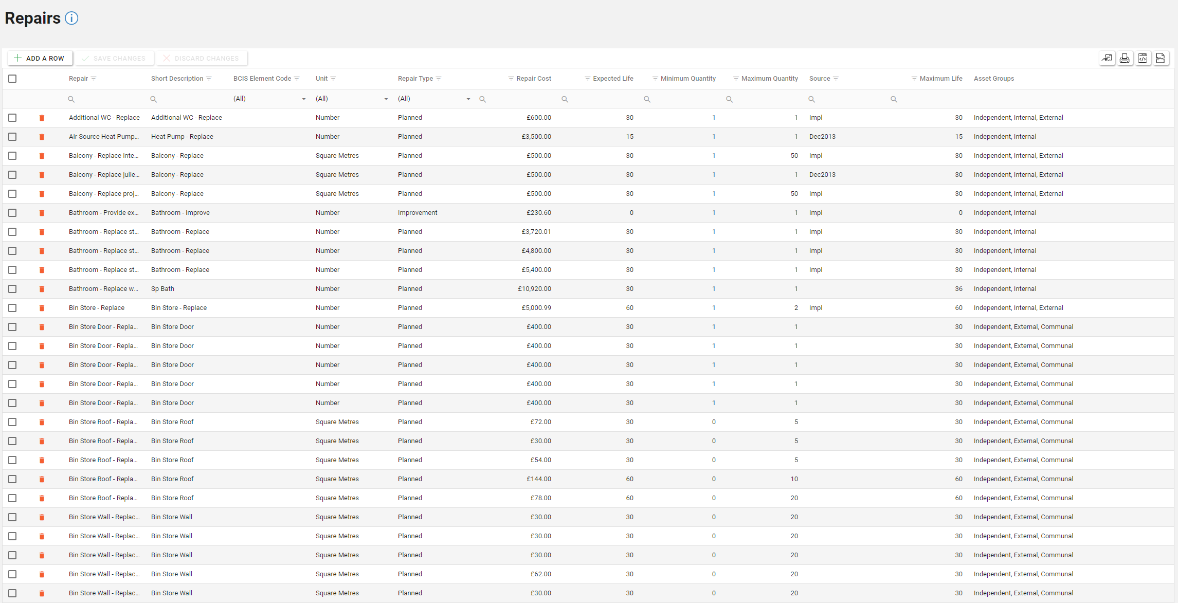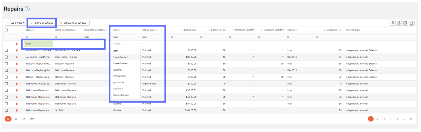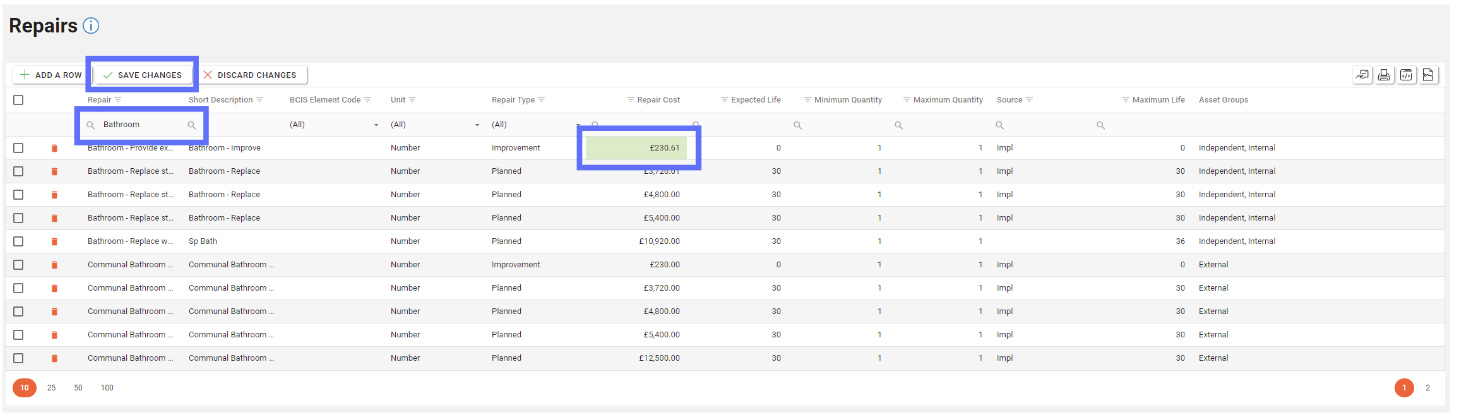 Periodically you will want to revise Repair cost estimates within this screen. This can be done easily by searching for the Repair in the search box directly underneath the Repair column header and updating the Repair Cost. (this applies to all other fields too)