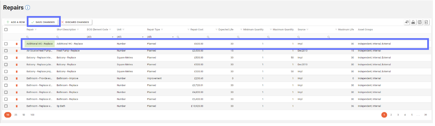 To edit an existing Repair, select the row you wish to edit and then select the field to be edited and overwrite the existing data present. When all changes are made to the relevant columns, click the “Save Changes” button.