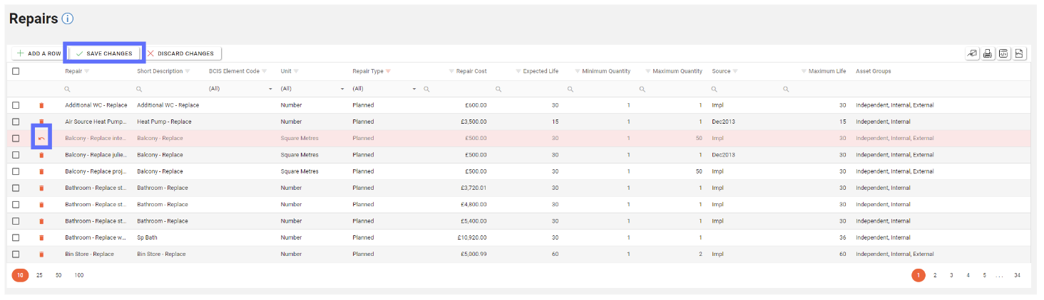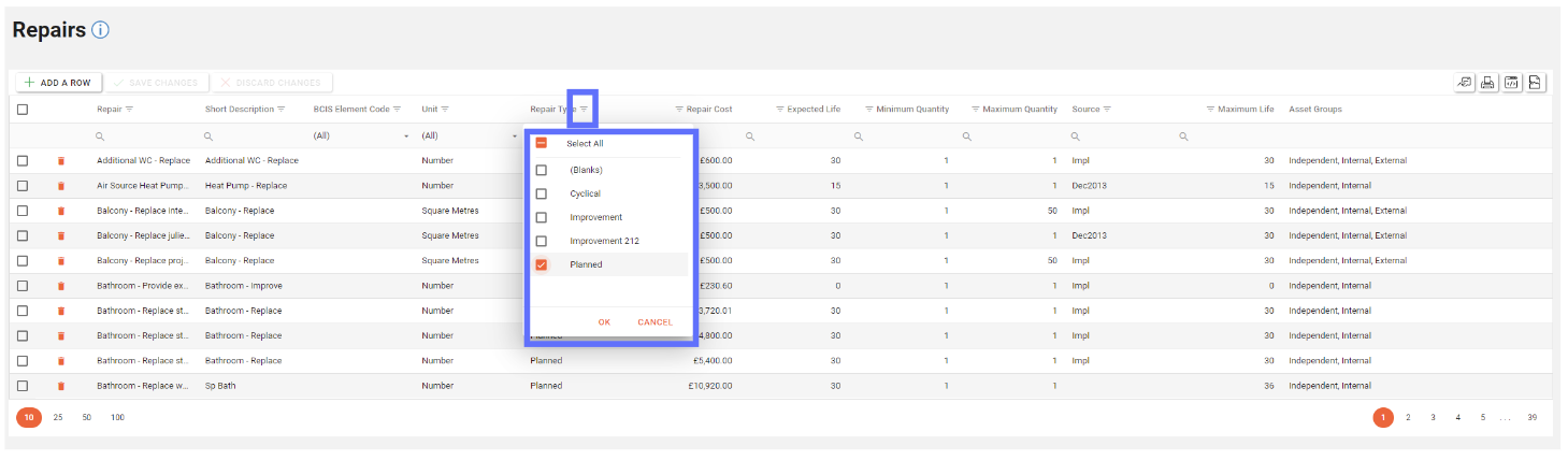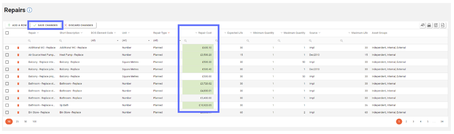 You can now bulk edit Repair rows, in this example we’re updating the Repair Cost for multiple “Planned” Repairs.