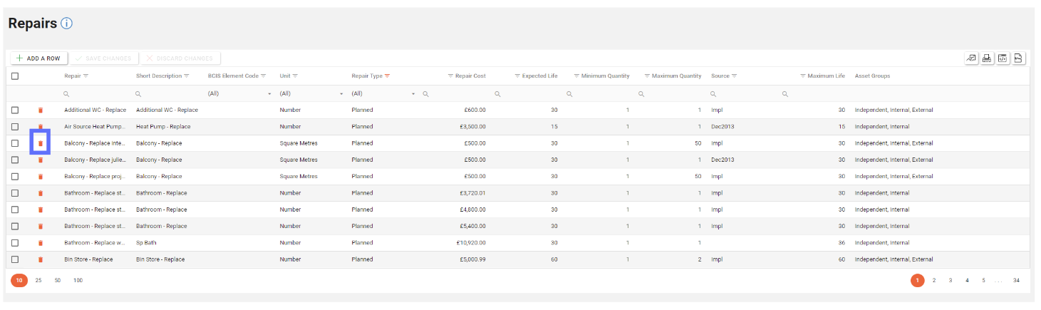 To delete an existing Repair click the trash can button in the row you wish to delete from Asprey Assets.