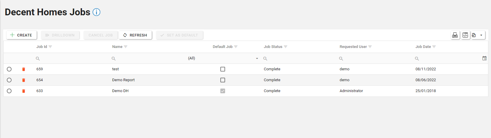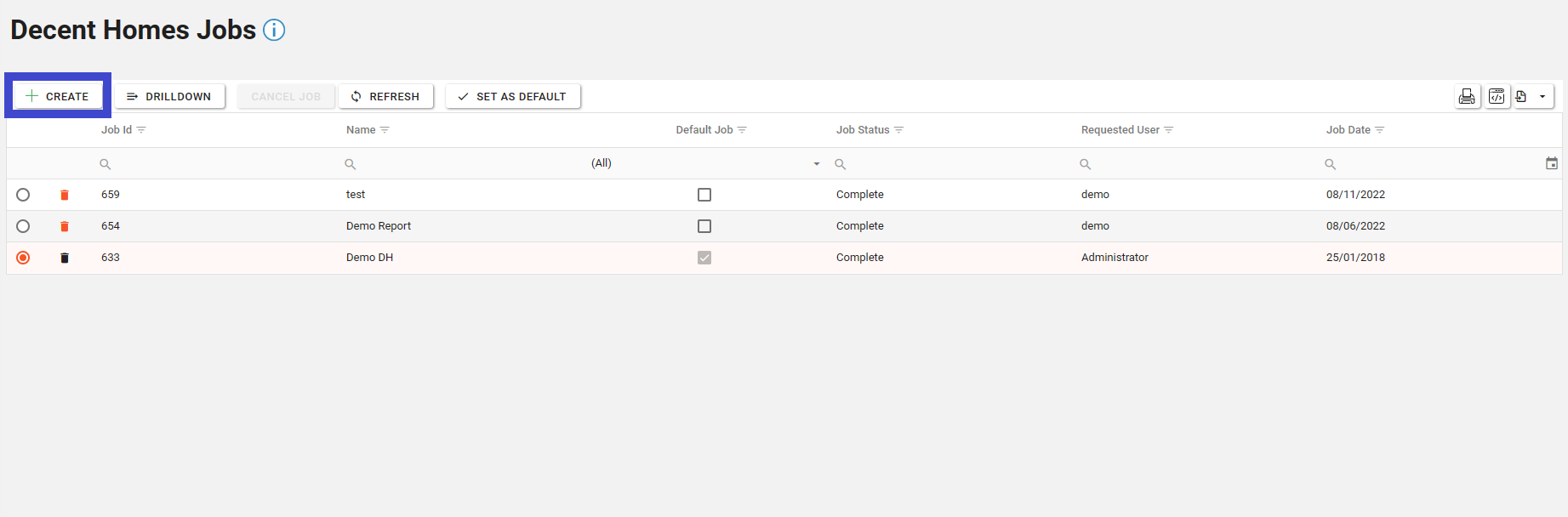 To create a new Decent Homes Job, click the “Create” button.