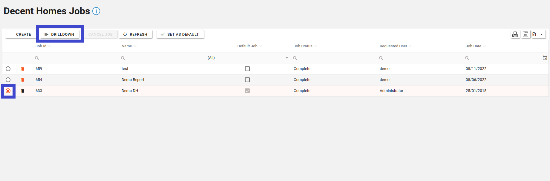To view an existing Decent Homes job, select the required job by clicking the selector icon in the leftmost column. Once selected, the job will be highlighted. Then click the “Drilldown” button to view the forecast.