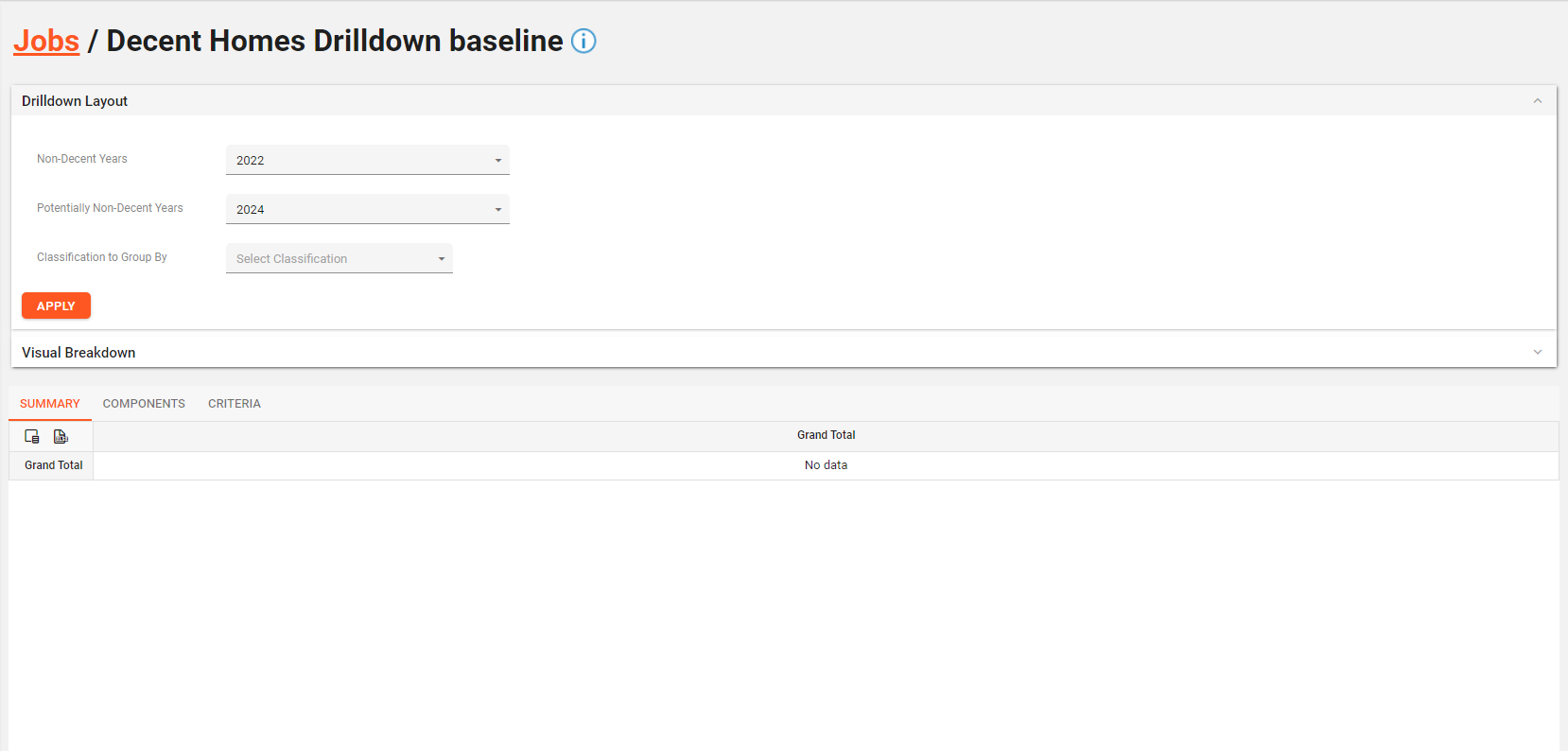 Once the parameters have been set, click the “Apply” button to view all the details of the Decent Homes Job.
