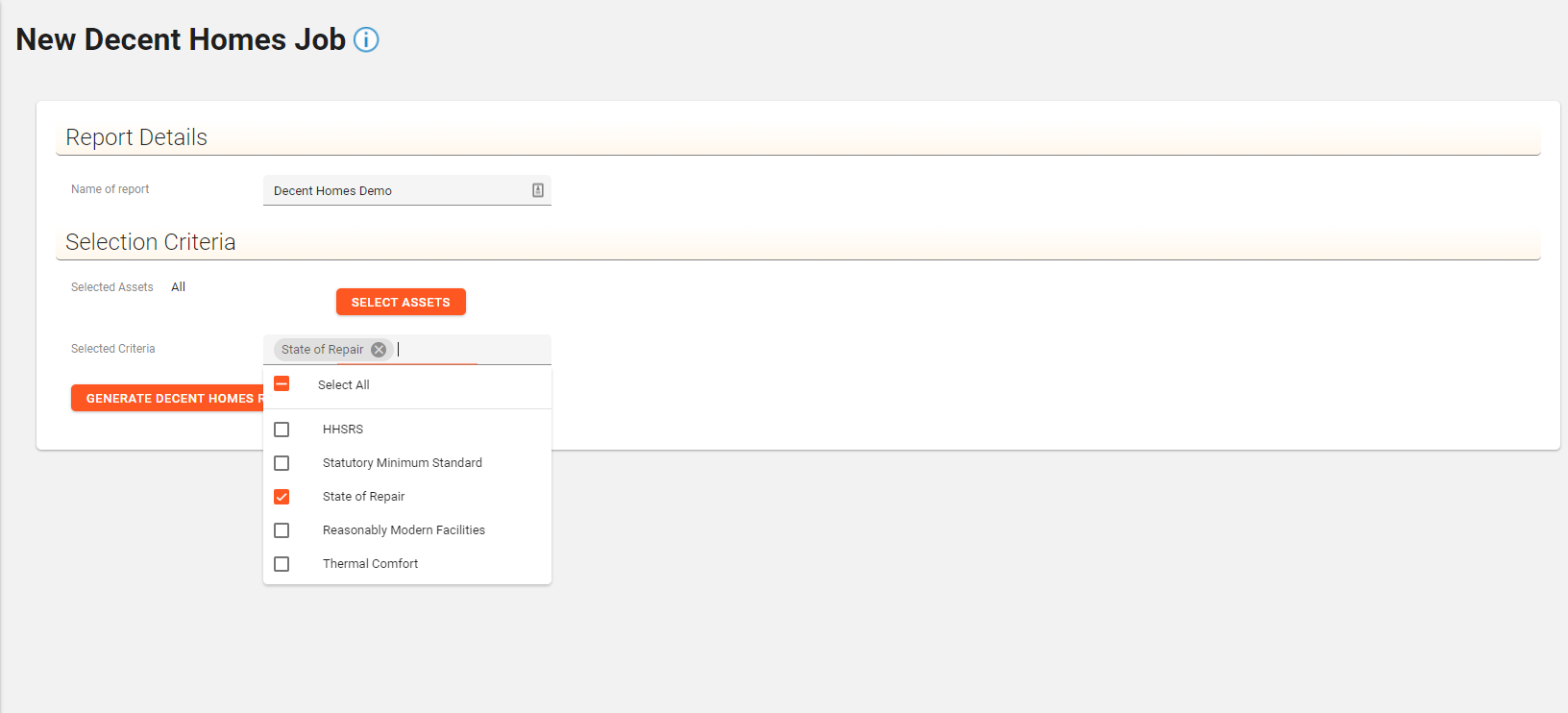 In the job creation screen, name the Decent Homes report and select the assets using the Asset Explorer and the criteria under which the Decent Homes Job is to be performed.