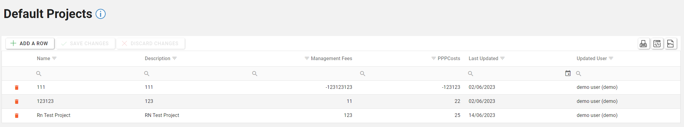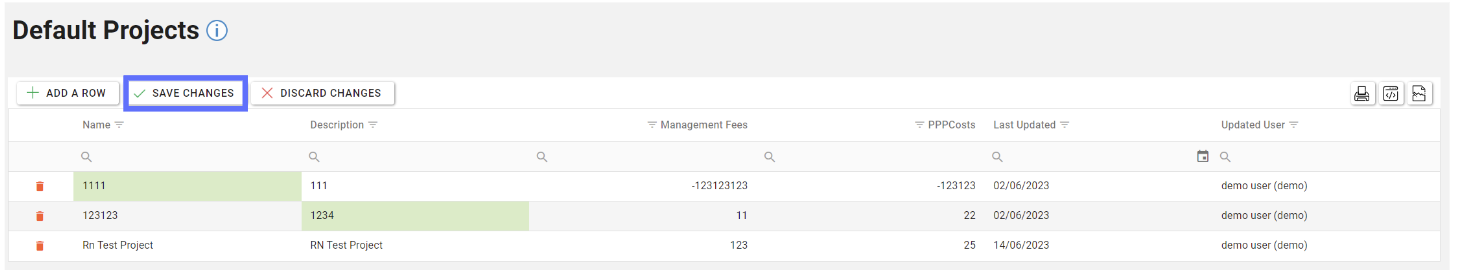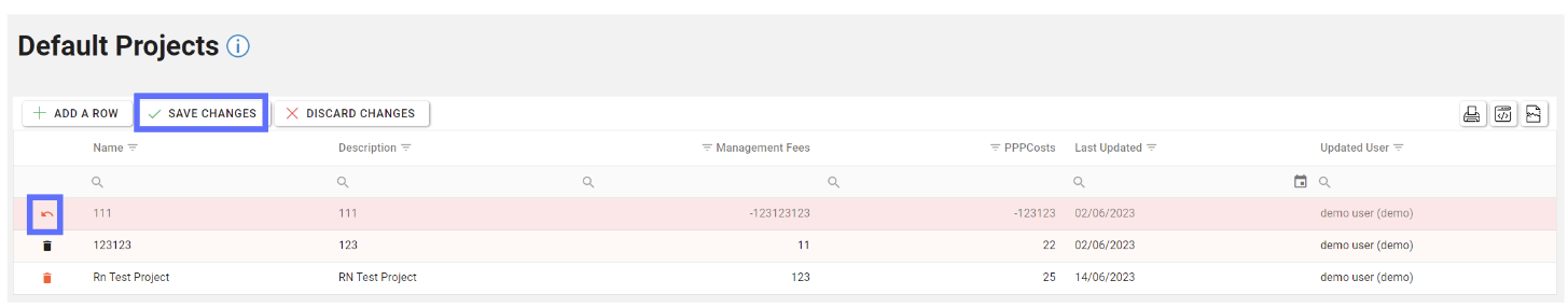 Unsaved changes to the grid can be undone by clicking on the “Discard Changes” button.