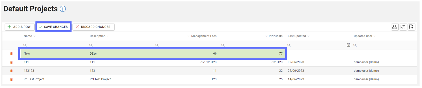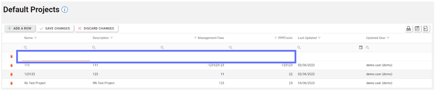 To create a Default Project click on the “Add A Row” button in the toolbar at the top of the screen.