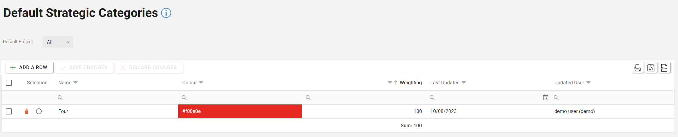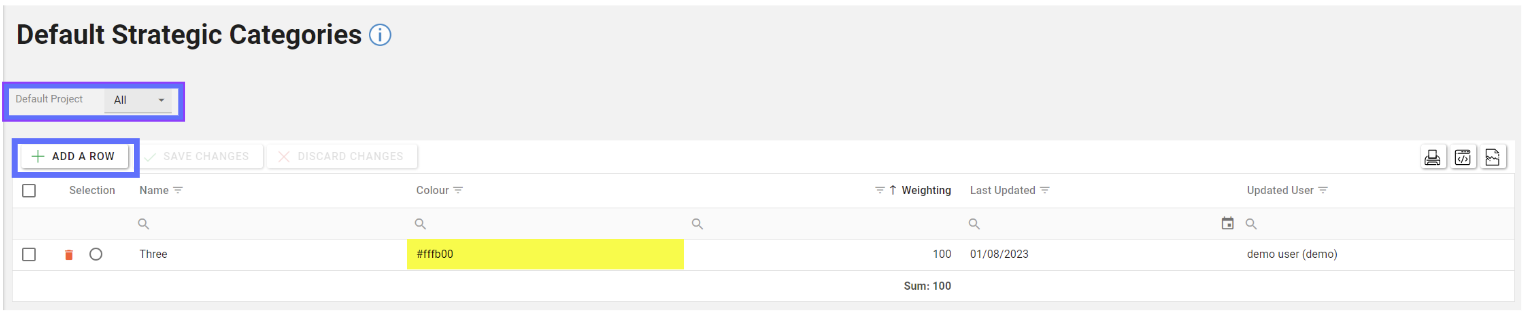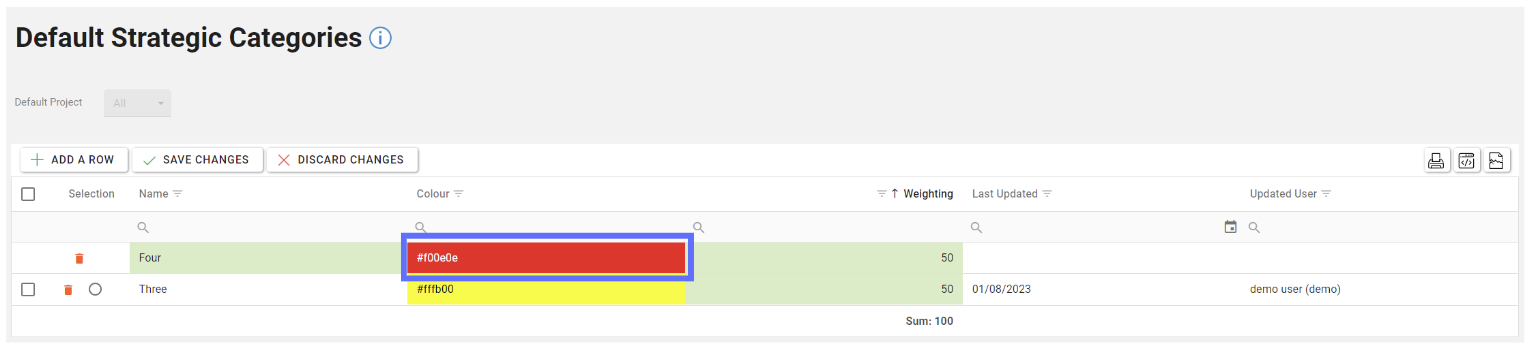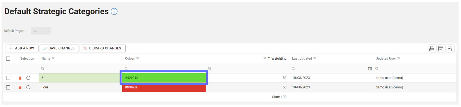 Colour | Text | A field to indicate the colour of the Default Strategic Category. The HEX value of the colour is stored in the database. |