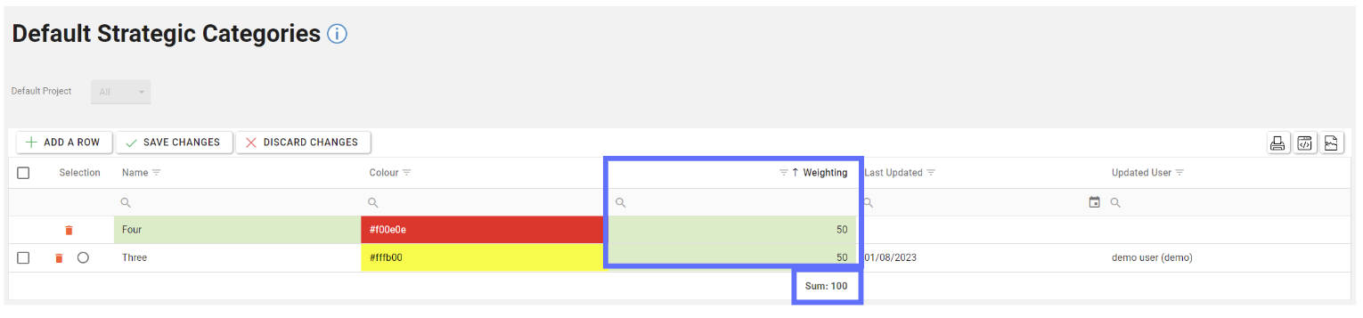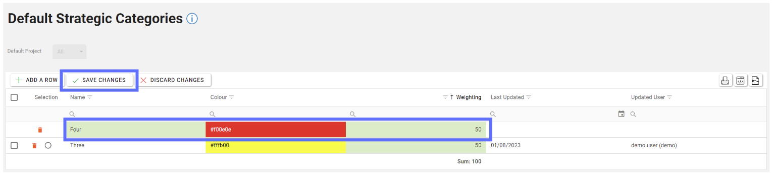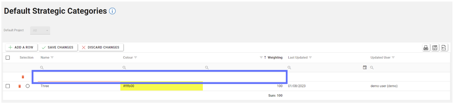 For every new row added you’ll need to adjust existing weightings to accommodate. For example, the existing Default Strategic Category had a rating of 100, so this needed to be lowered to 50 to allow the new row with a weighting of 50.