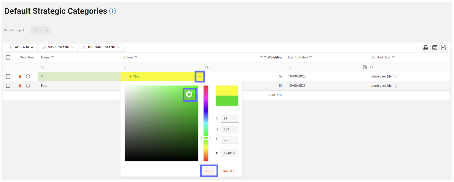When choosing a colour for the new Default Strategic Category, you will need to click on the upwards arrow located on the right-hand side of the colour cell. This will open a colour picker from which you are free to choose whichever colour you want to assign to the Default Strategic Category using the white circle picker. When you’ve settled on a colour, click on the “Ok” button to assign the colour.