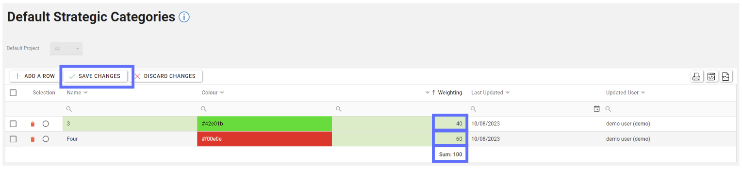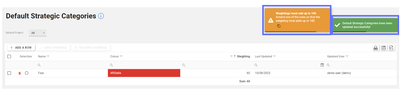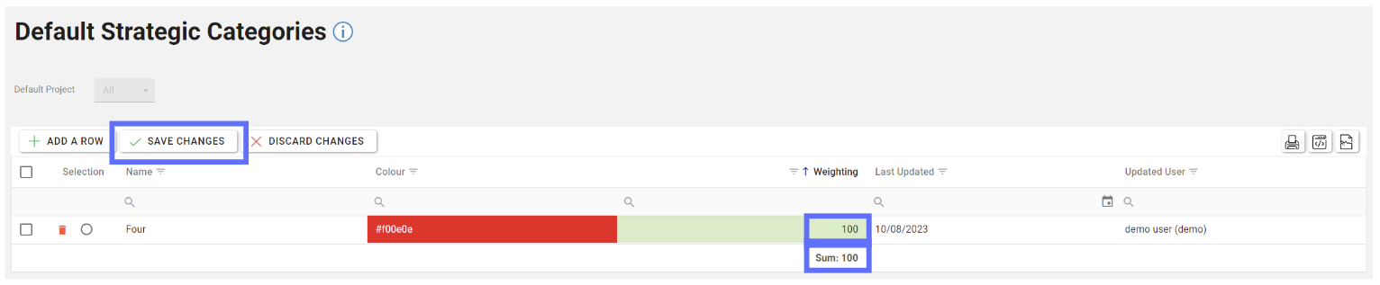 If the total weightings for ALL Default Strategic Categories don’t add up to 100 you won’t be able to save the changes until the weightings have been corrected.