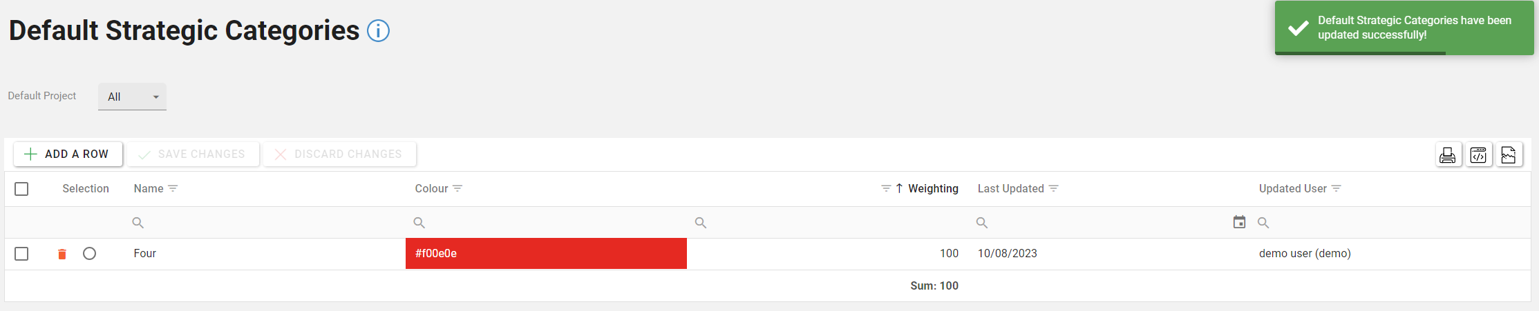 The changes will be saved to the database, this will be confirmed by the green toast popup message in the top right corner of the screen, reporting “Default Strategic Categories have been updated successfully!”.