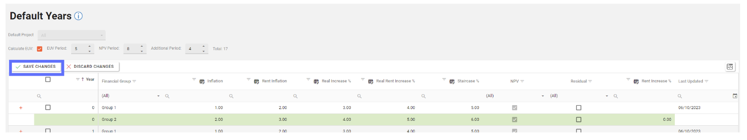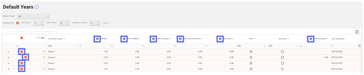 The Default Years grid allows bulk updates for the following columns: