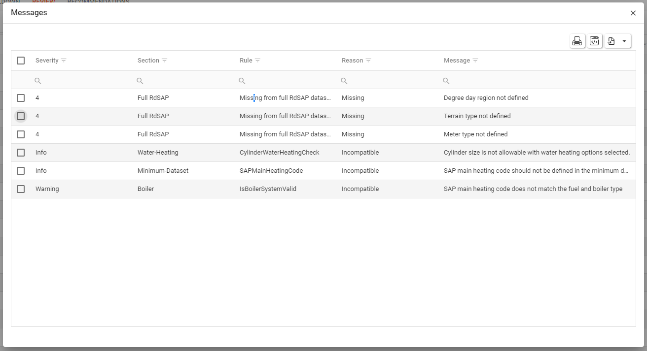 The recommendations messages dialogue box will appear and show the underlying data for the energy calculations.