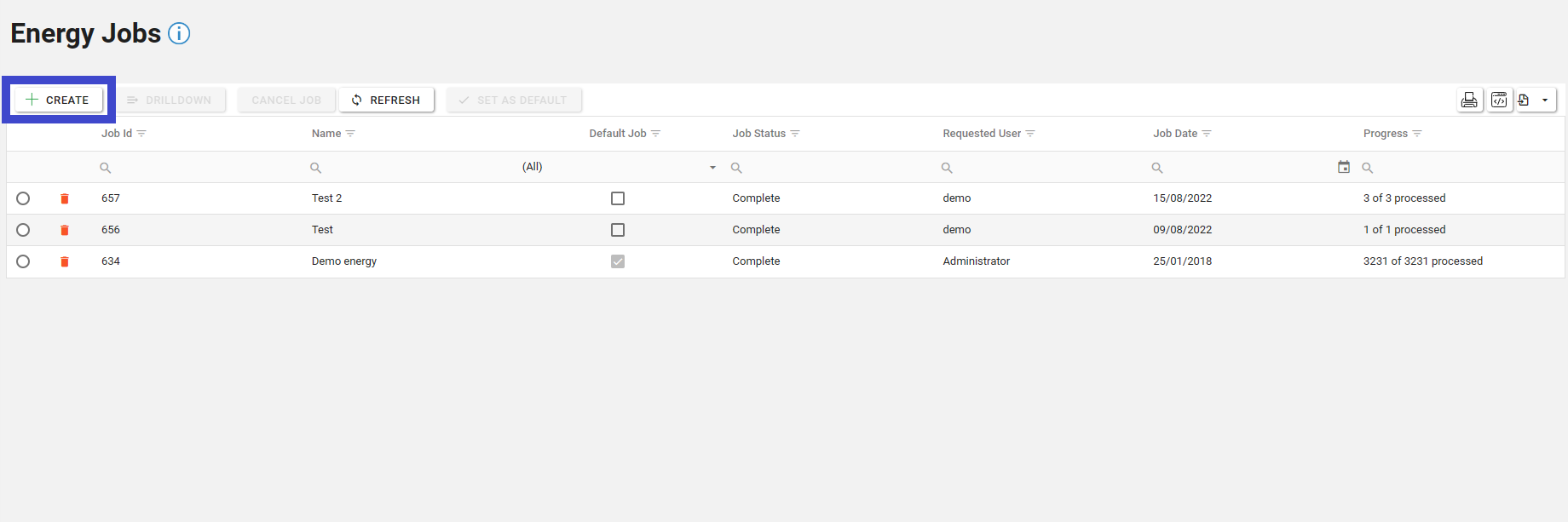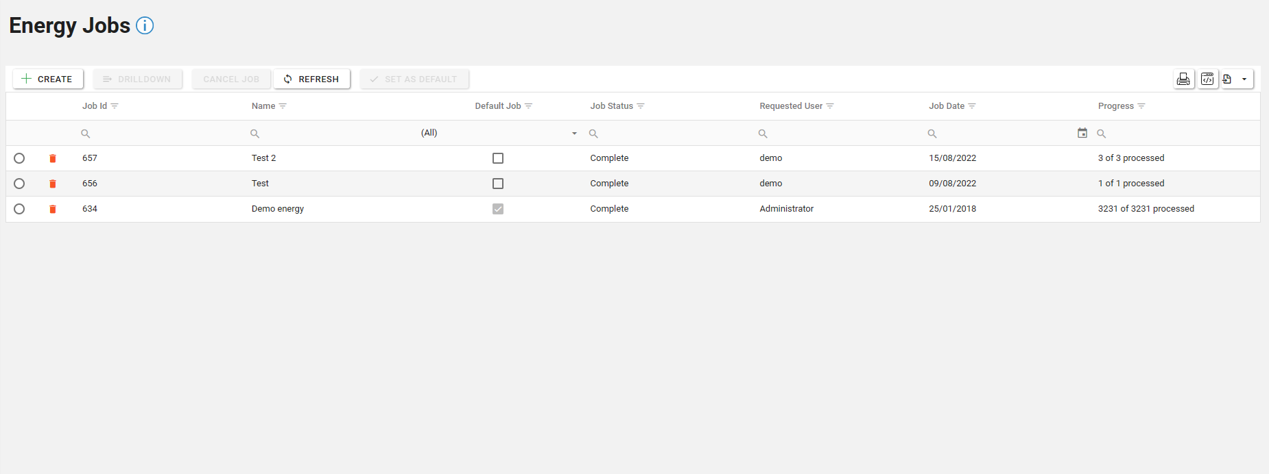 The Energy Jobs section allows users to create and view Energy forecasts from the Asprey Assets data.