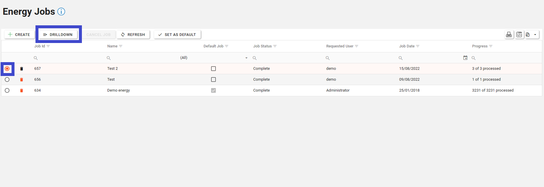To view an existing Energy Job, select the required job by clicking the selector icon in the leftmost column. Once selected, the job will be highlighted. Then click the “Drilldown” button to view the Forecast.