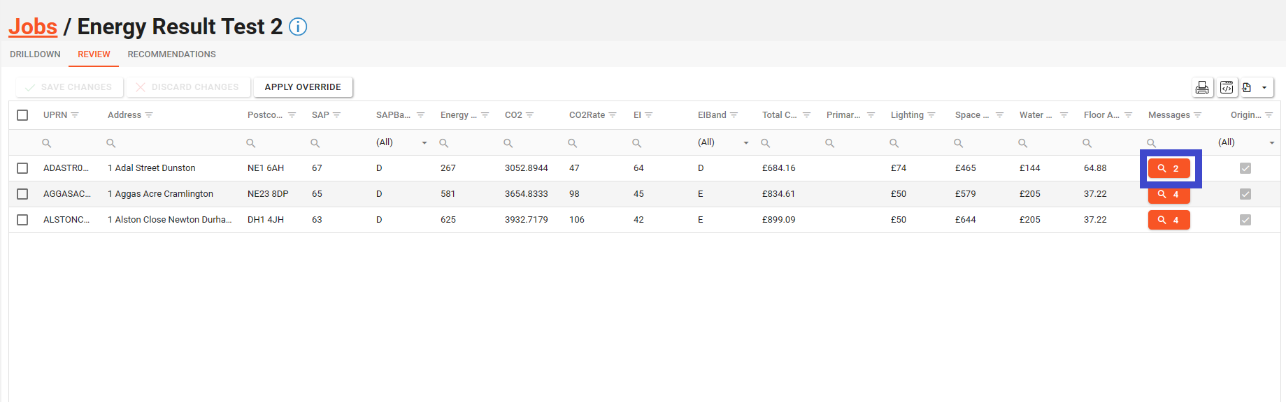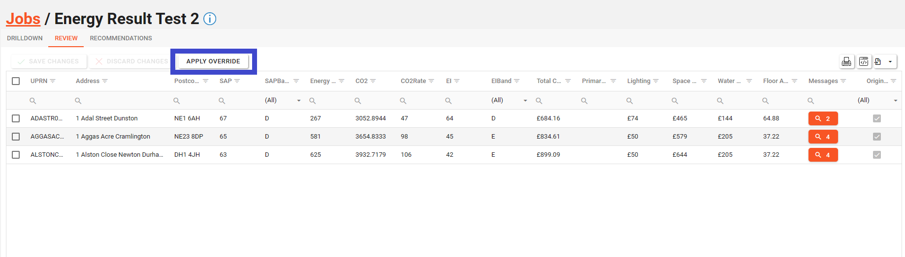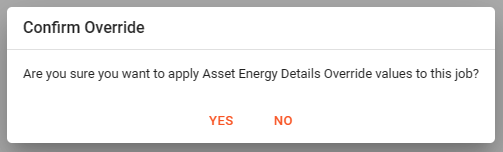 If asset energy override values have been added in the asset details, these can be applied to the energy job by clicking the “Apply Override” button.