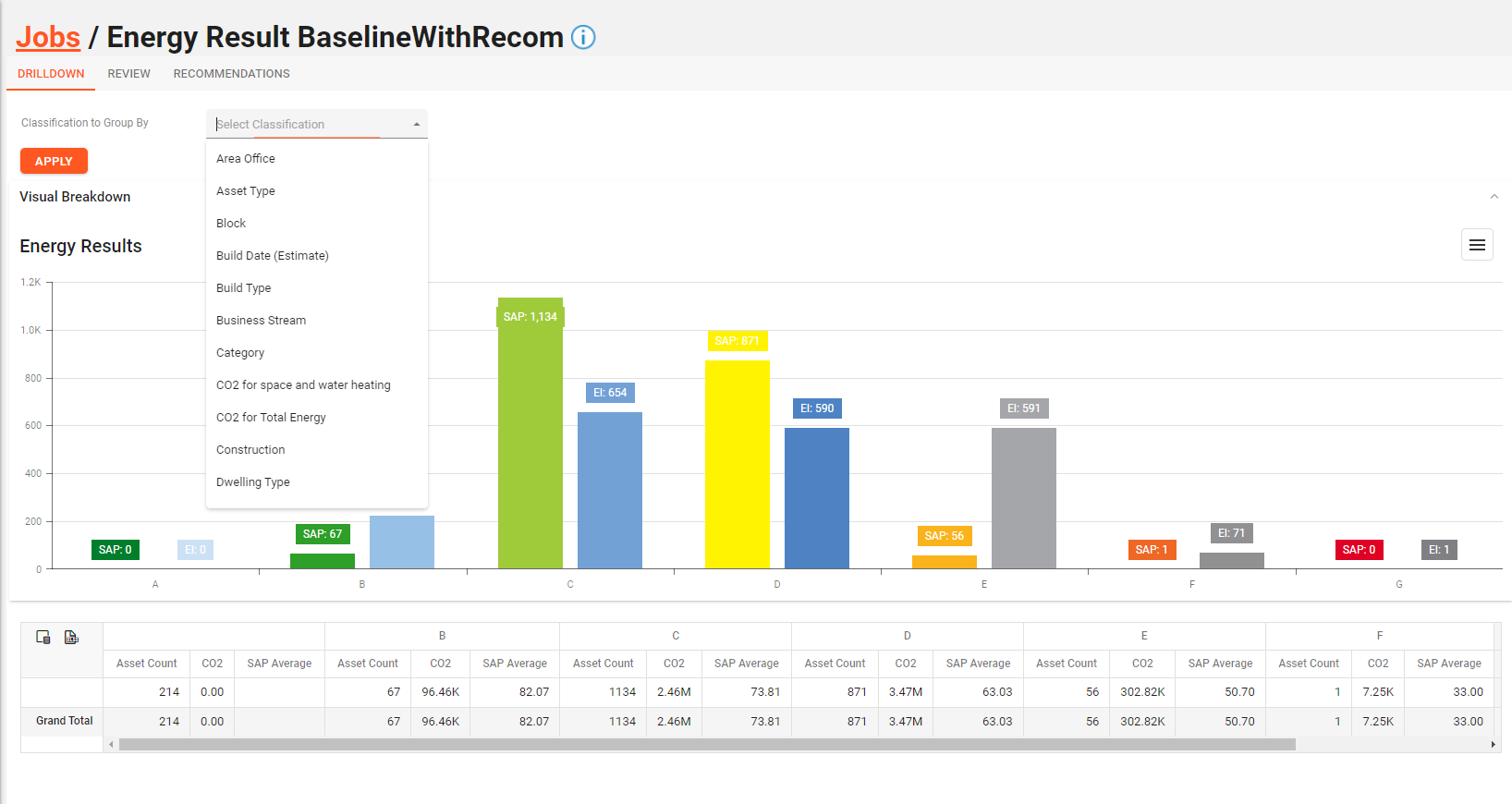 The “Drilldown” tab shows the details of the energy job in detail and allows for the data to be grouped by classification. to apply a classification grouping, select the classification from the dropdown and click apply.