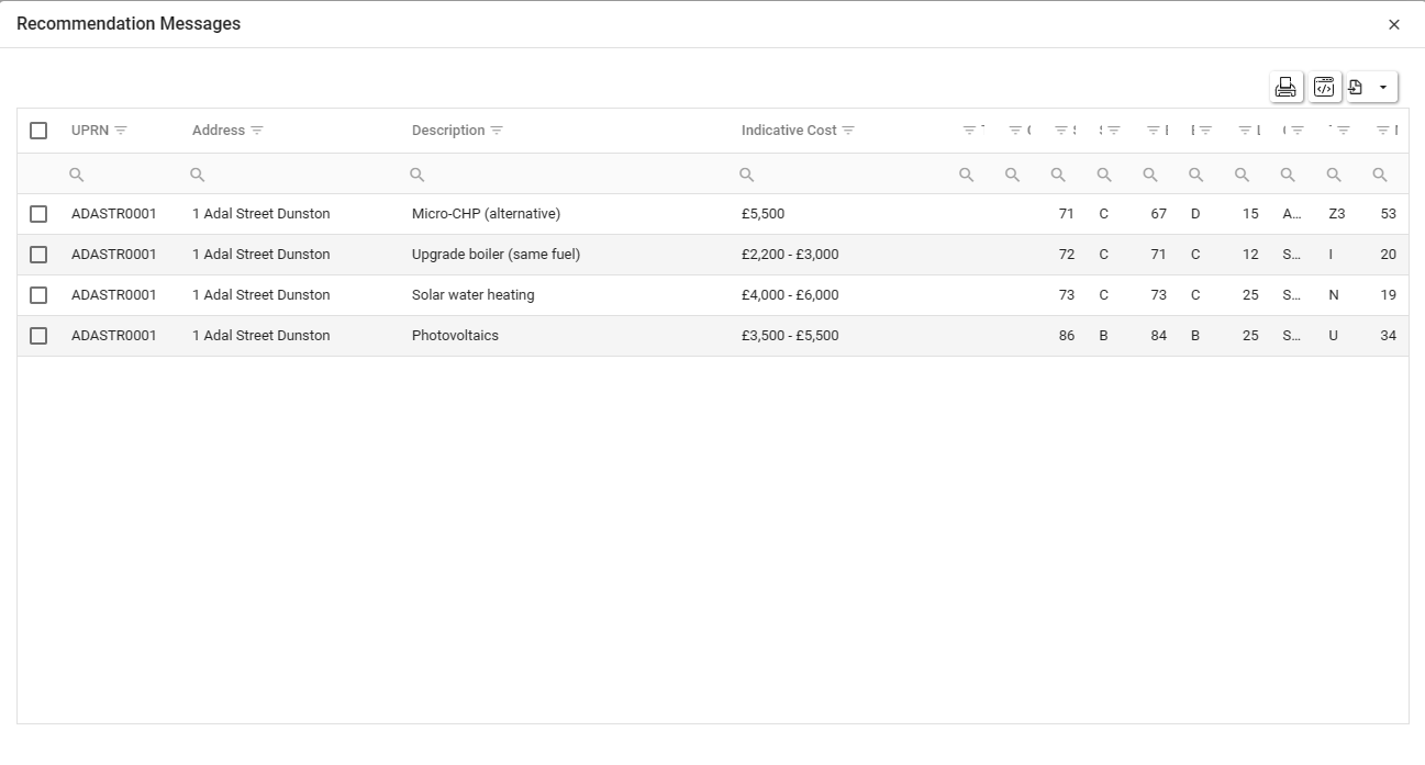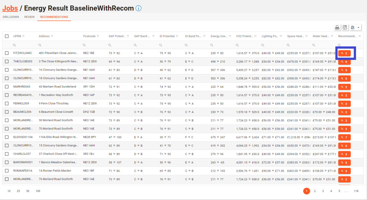 The recommendations tab shows the details of the recommendations made following the completion of the energy job. To view the full details of the recommendation, click the magnifying glass icon on the right-hand side with the number indicator.